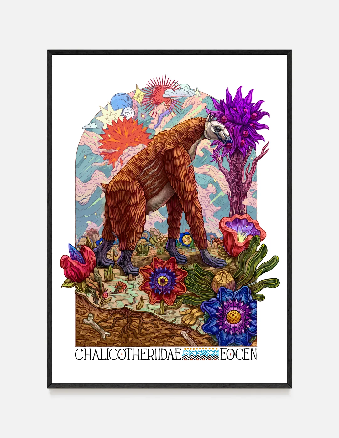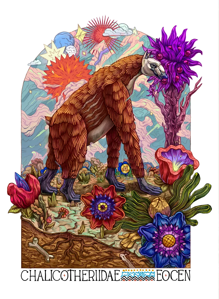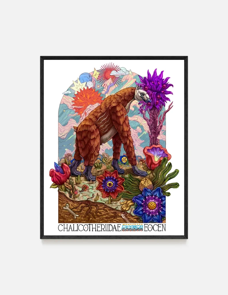 Plakat Chalikoterium przedstawia prehistorycznego ssaka z rodziny Chalicotheriidae, żyjącego w epoce eocenu. Autorska ilustracja inspirowana paleontologią i ewolucją. Chalikoteria należały do tej samej linii ewolucyjnej co konie, nosorożce i tapiry, jednak wyróżniały się nietypową budową ciała oraz długimi, zakrzywionymi pazurami, których używały do przyciągania gałęzi i roślin.