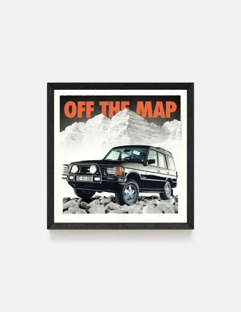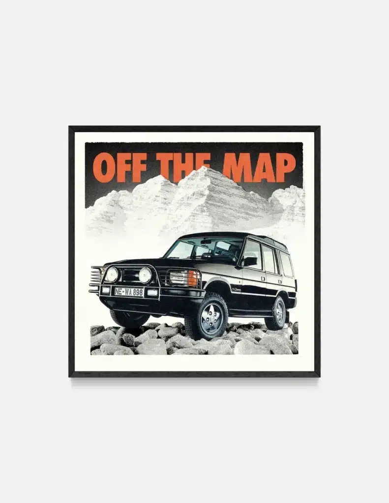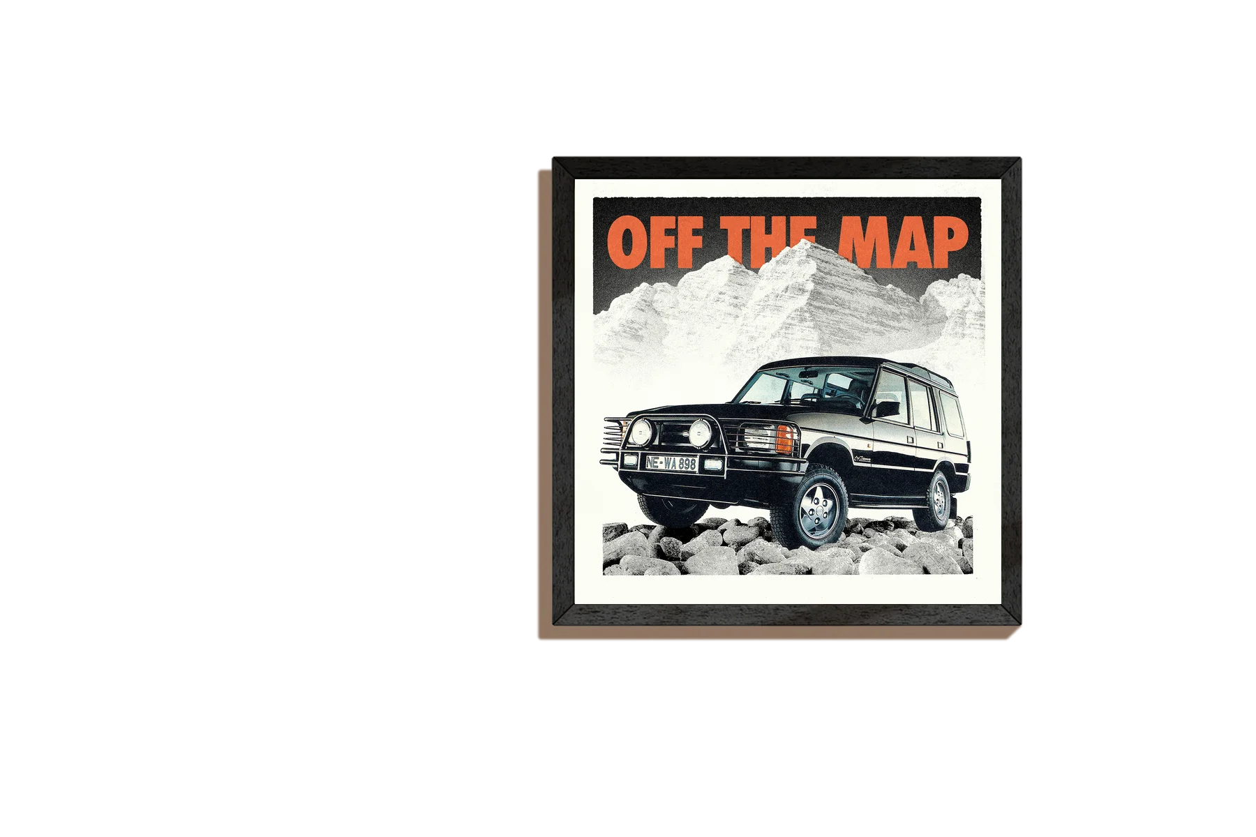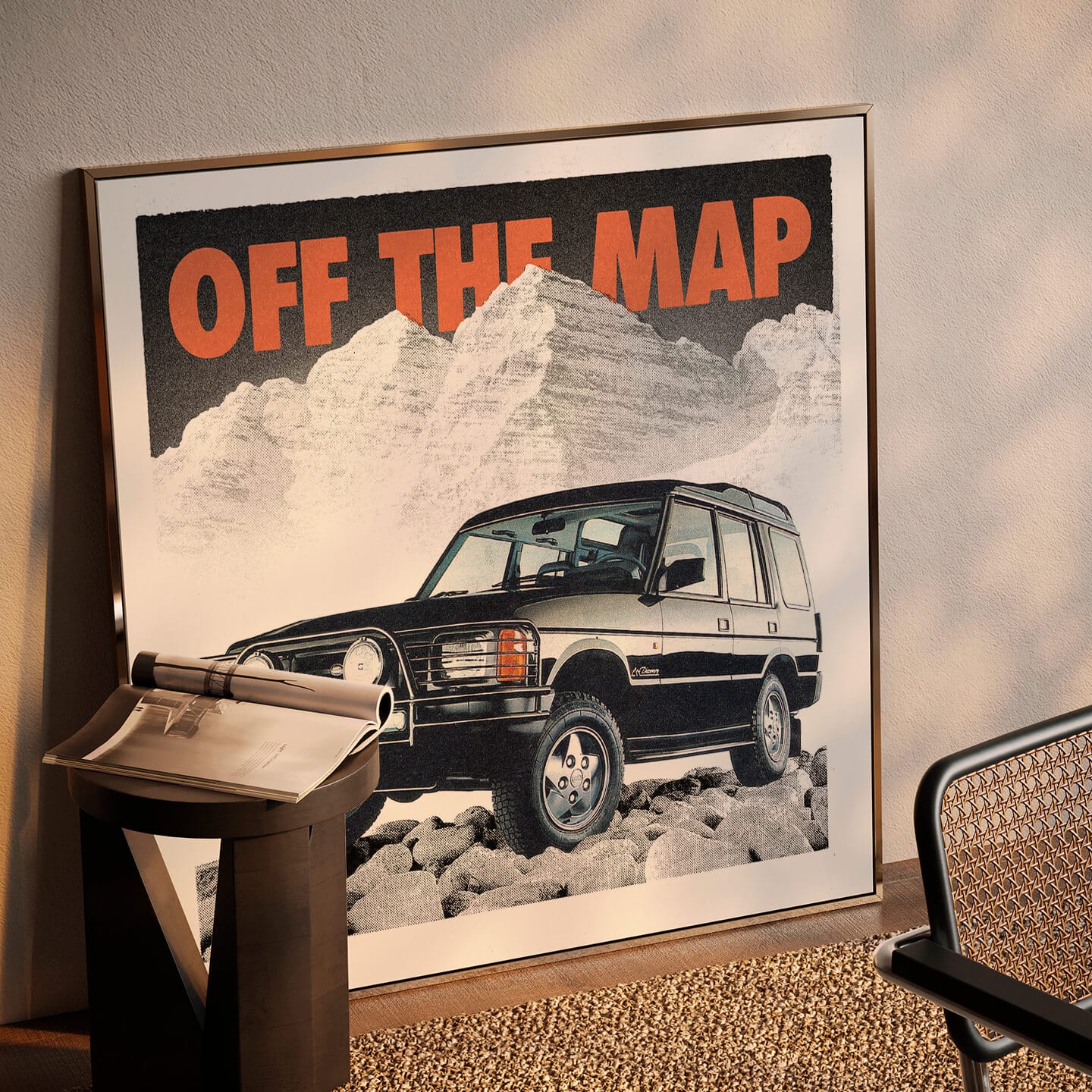 Oryginalny plakat motoryzacyjny Land Rover – OFF THE MAP  autorstwa Ładne.co w formacie 25×25, 32×32 i 50×50 cm.